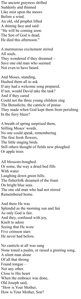 For this beautiful solemnity, after completing the Novena to Saint Joseph, I want to share with you a poem by Sister Mary Ada, OSJ. How wonderfully does the imagery call to mind the final prayers of the novena invoking Saint Joseph as the Patron of a Happy Death. The poem is commonly associated with the Easter Vigil, and you will see why.